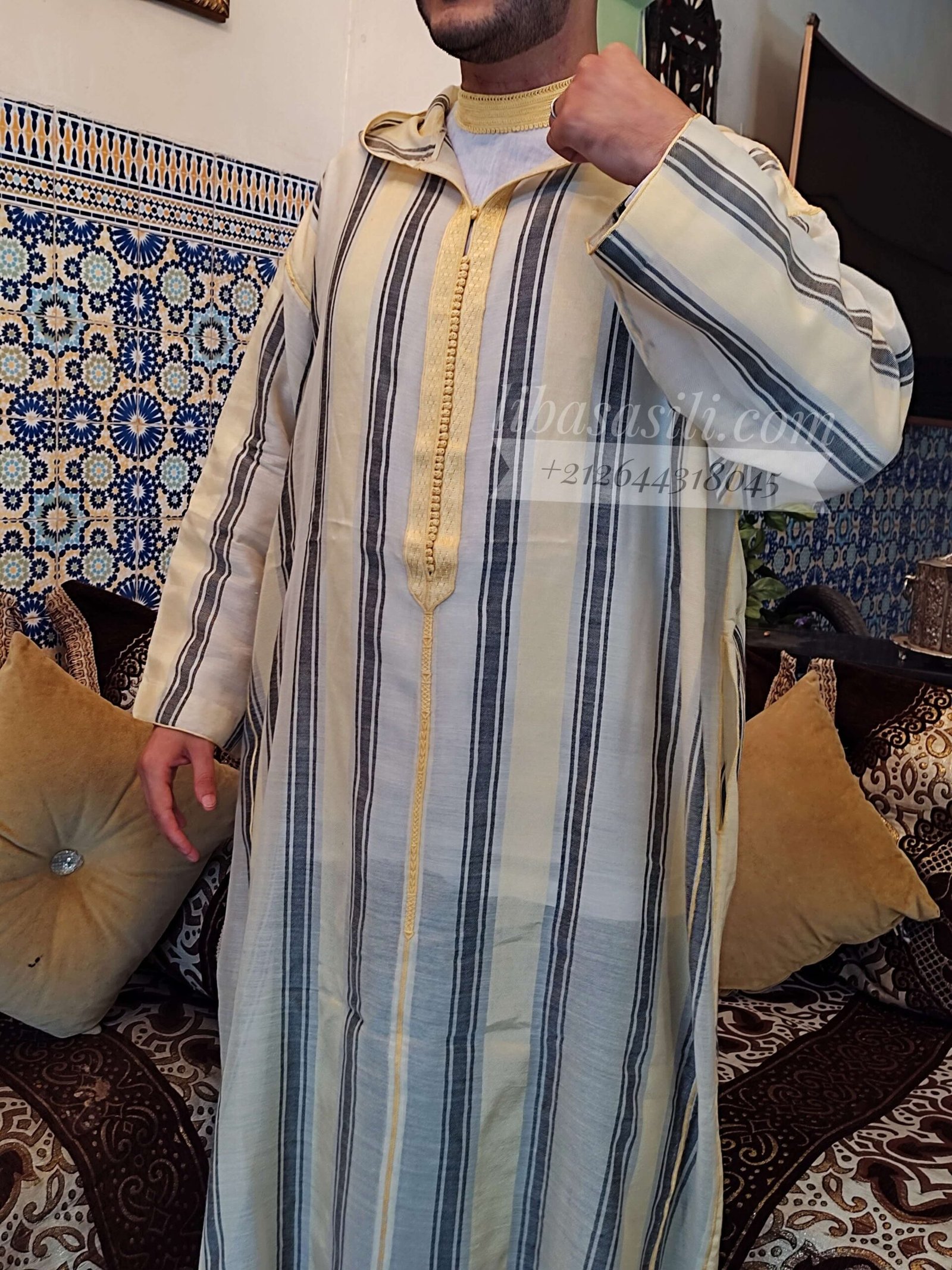 تأتي الجلابة بلون راقٍ يجمع بين الأصفر الفاتح والرمادي المخطط، وتُرفق مع **ركابية وسروال قندريسي** من **ثوب قطني ناعم ومخيطين باليد** لضمان الراحة والأناقة في كل مناسبة.